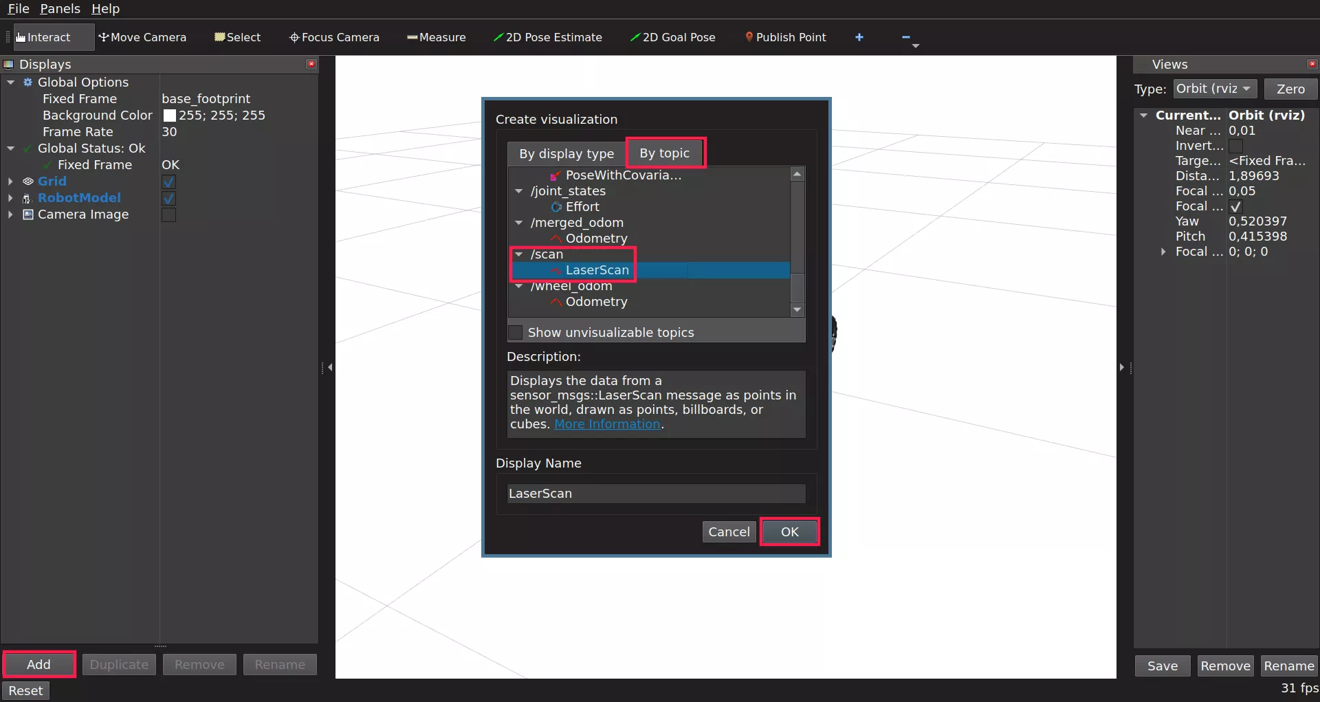 topic. Choose the LaserScan display and click Ok.