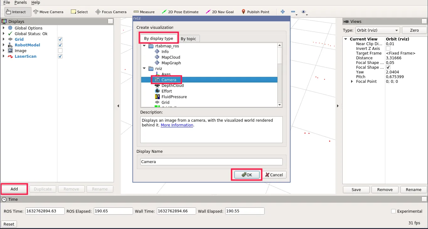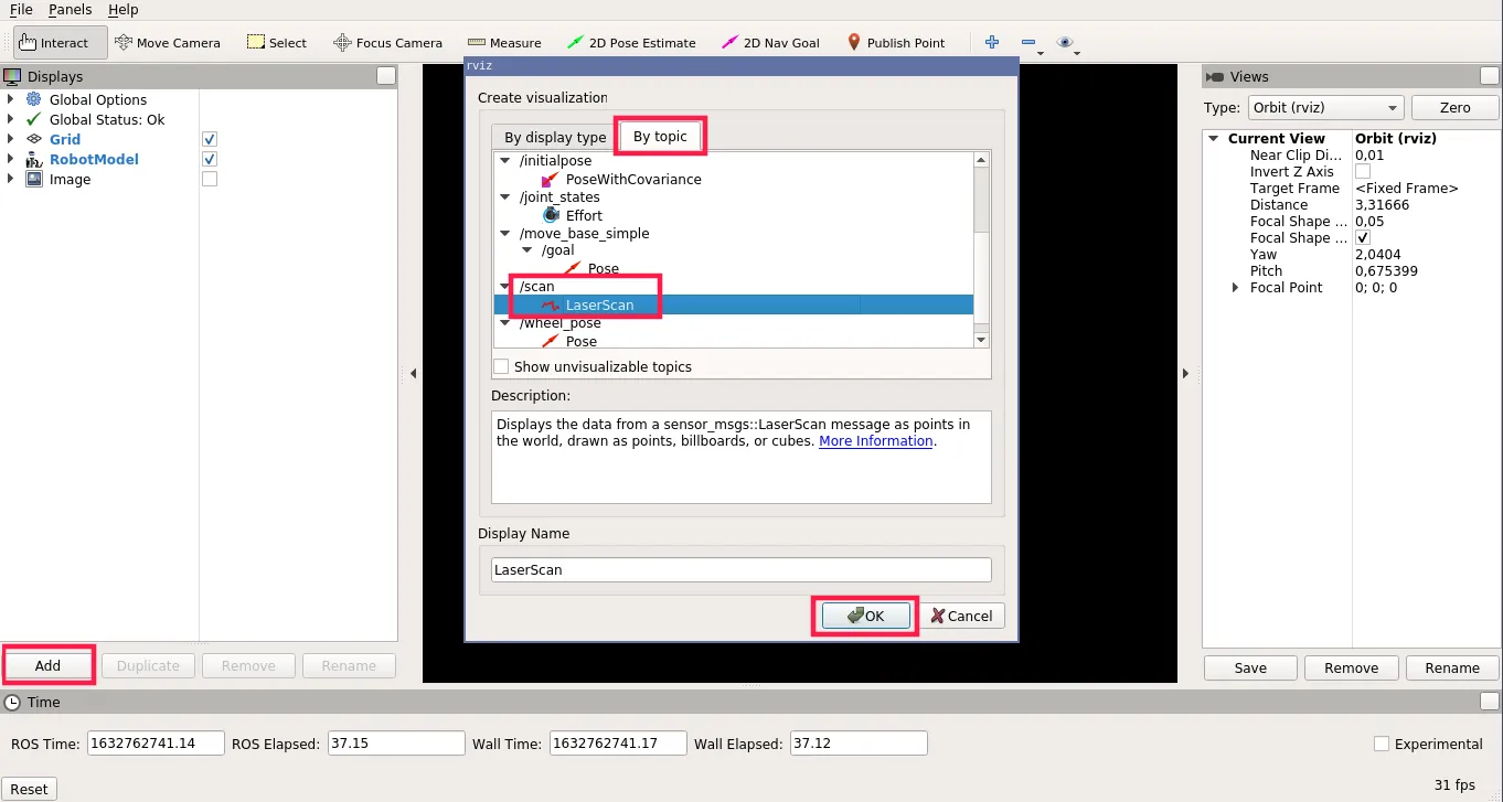On the Displays panel click Add -> By topic and search for the /scan topic. Choose the LaserScan display and click Ok.